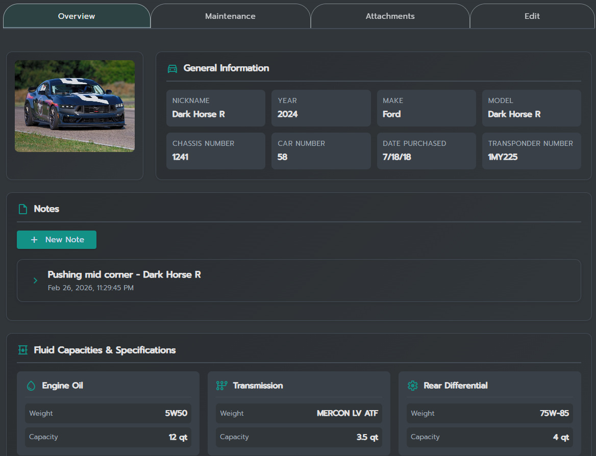 Each car has a single place for specs, notes, and attachments.