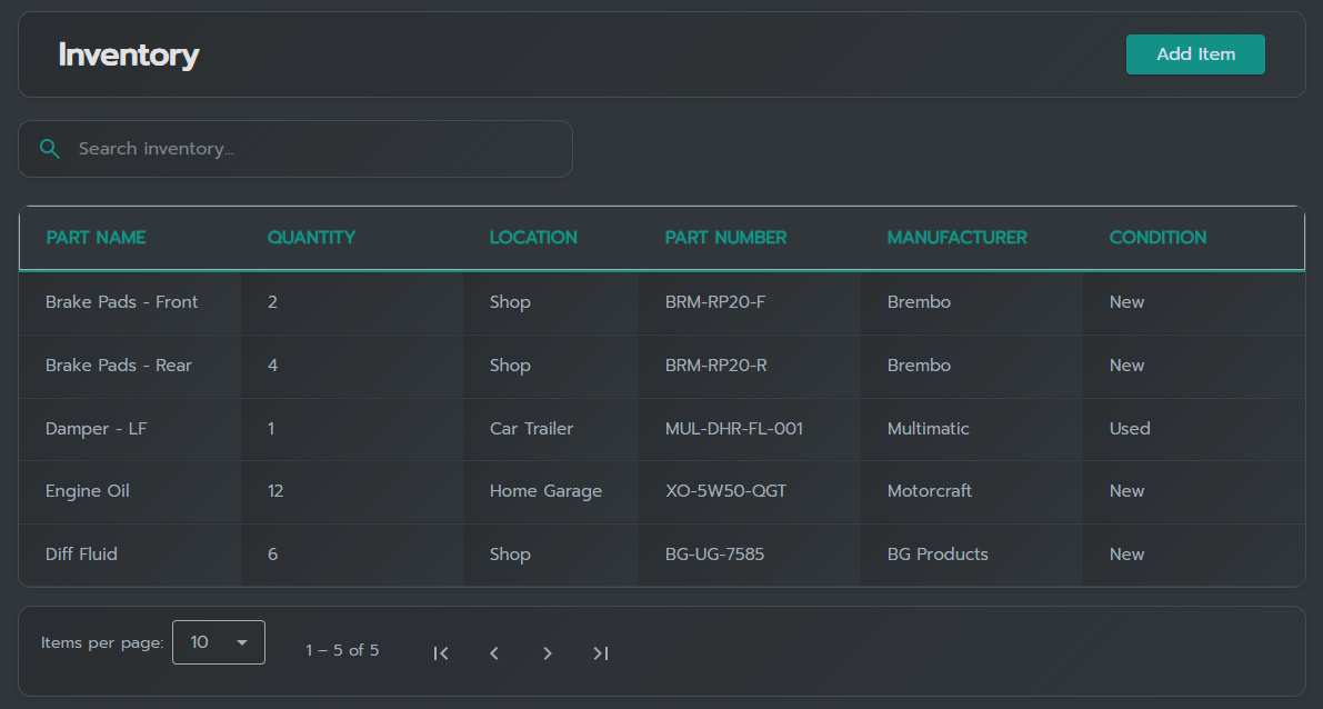 Keep parts and consumables organized across the season.